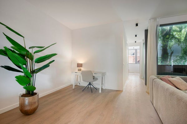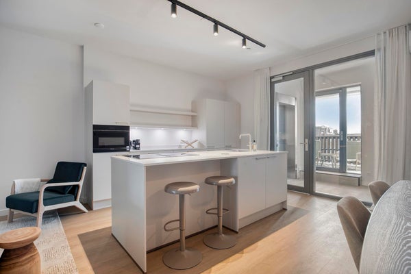 Die möblierte Wohnung verfügt über ein geräumiges Wohnzimmer (ausgestattet mit Klimaanlage) mit einer luxuriösen offenen Küche, ausgestattet mit einer Stein-Arbeitsplatte und einer elektrischen Induktionskochplatte mit integrierter Dunstabzughaube, Quooker, Geschirrspüler, Kühlschrank, Gefrierschrank und Mikrowelle-Backofen-Kombination (alle Geräte von Siemens/Bosch).