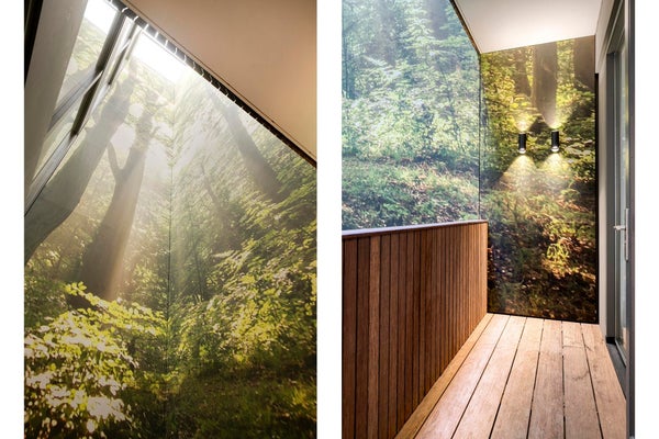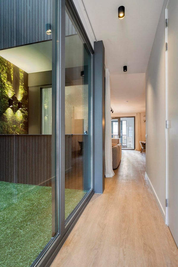 Die Wohnung verfügt auch über einen überdachten Innenhof. Dieser Innenhof verfügt über einen Lichtschacht und ist mit einem akustischen Paneel ausgestattet, das den Raum wie einen Außenbereich erscheinen lässt und gleichzeitig für Ruhe sorgt.