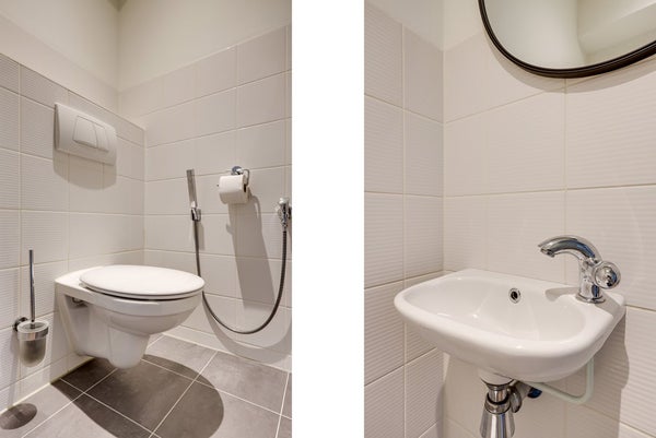Eine separate hängende Toilette mit Fliesenboden, einem Waschbecken und einem Bidet-Set.