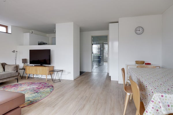 Das geräumige Wohnzimmer ist mit Laminatboden versehen und hat Doppeltüren zur geräumigen Dachterrasse an der Vorderseite mit einem herrlichen Blick auf die Jan van Lieshoutstraat/Dachterrasse der Heuvel Galerie.