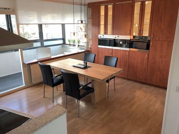 In der großzügigen, luxuriösen Küche befindet sich eine Essecke. Die Küche ist mit allen Geräten und Küchenutensilien ausgestattet, wie zum Beispiel einem kompletten Geschirrset. Die umfassende Küche enthält unter anderem ein Cerankochfeld mit Dunstabzugshaube, einen Geschirrspüler, einen Kühlschrank, eine Kombimikrowelle, eine Kaffeemaschine, einen Dampfer und einen Wasserkocher. Vom Küchenraum aus ist die Loggia erreichbar.