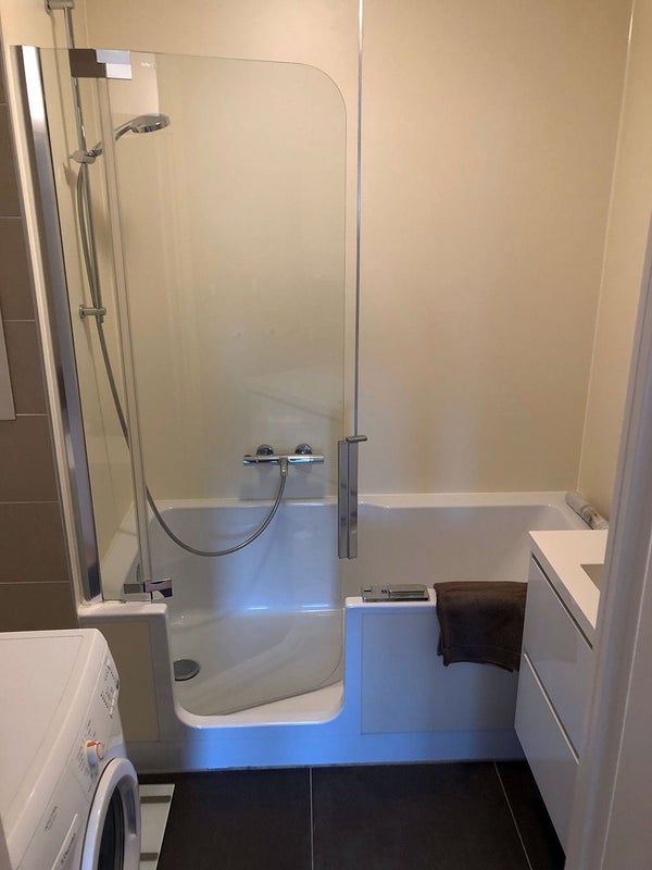 Das Badezimmer ist teilweise gefliest. Es ist ausgestattet mit einer komfortablen Badewanne-Dusche-Kombination und einem Waschbecken mit modernem Möbelstück. In dem Badezimmer befindet sich auch die Waschmaschine.