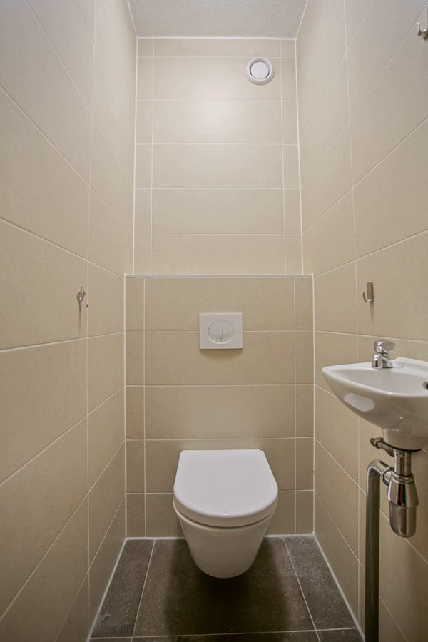 Teilweise gefliest mit Wand-WC und Waschbecken.