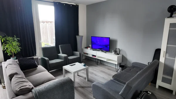 Schönes Haus mit einem Flur, WC, Wohnzimmer mit offener Küche und Garten mit Gartenhaus im Erdgeschoss, drei Schlafzimmer, zweites WC und Badezimmer im ersten Stock sowie einem großen Dachzimmer im zweiten Stock.