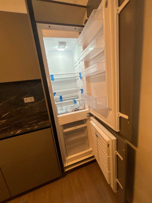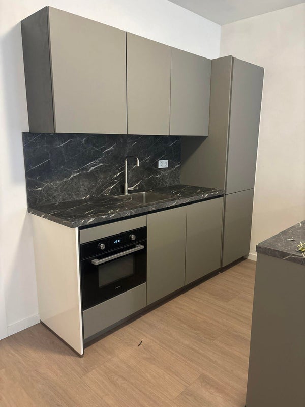 - Moderne offene Küche mit Einbaugeräten: Induktionskochfeld, Dunstabzugshaube, Kühlschrank mit Gefrierfach, Geschirrspüler, Kombi-Mikrowelle und viel Stauraum