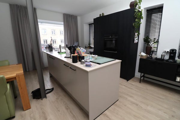 Die offene Küche verfügt über eine moderne Küchenzeile mit einer großzügigen Kochinsel. Die Küche ist mit allen Annehmlichkeiten ausgestattet: ein Kombi-Backofen, ein Kochfeld, eine Dunstabzugshaube, eine Geschirrspülmaschine, ein Kühlschrank und ein Gefrierschrank.