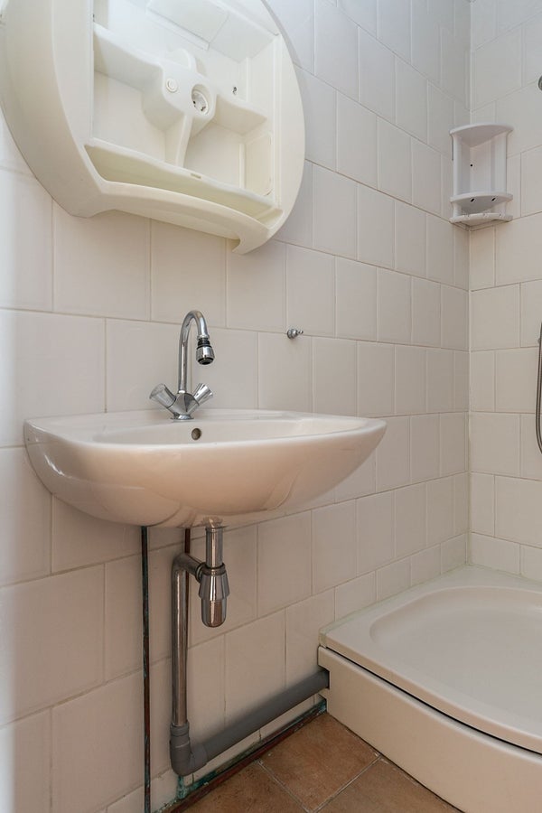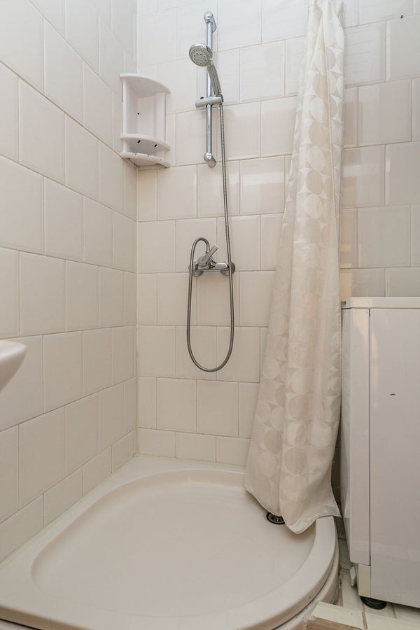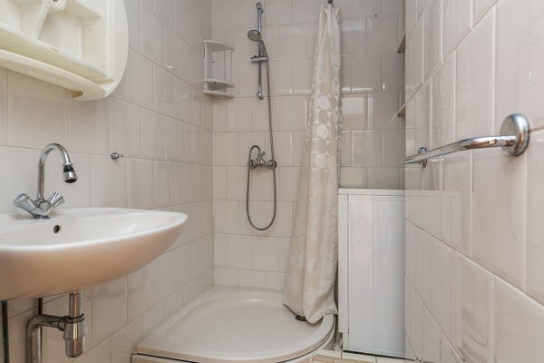Das Badezimmer ist mit einer Dusche, einem Waschbecken und einem Anschluss für die Waschmaschine ausgestattet.