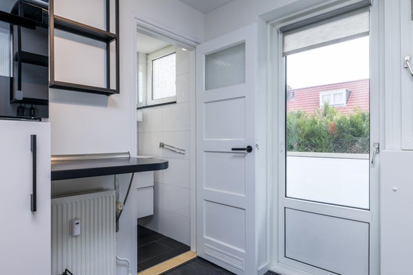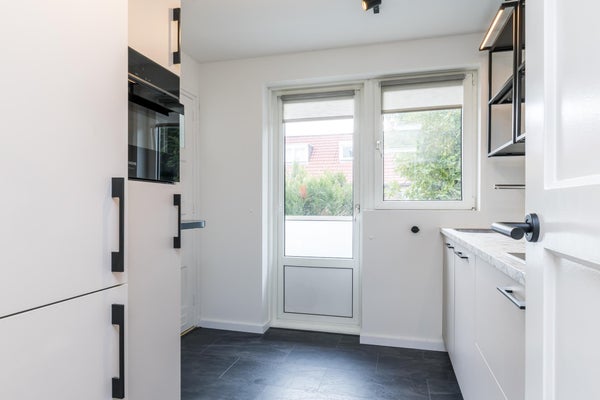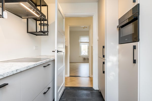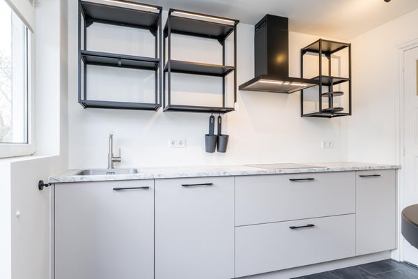 Separate Küche mit Installation und Geräten wie Induktionskochfeld, (Kombi-)Ofen, Dunstabzugshaube, Geschirrspüler, Kühlschrank, Waschmaschinenanschluss sowie Tür zum Badezimmer und Zugang zum Balkon
