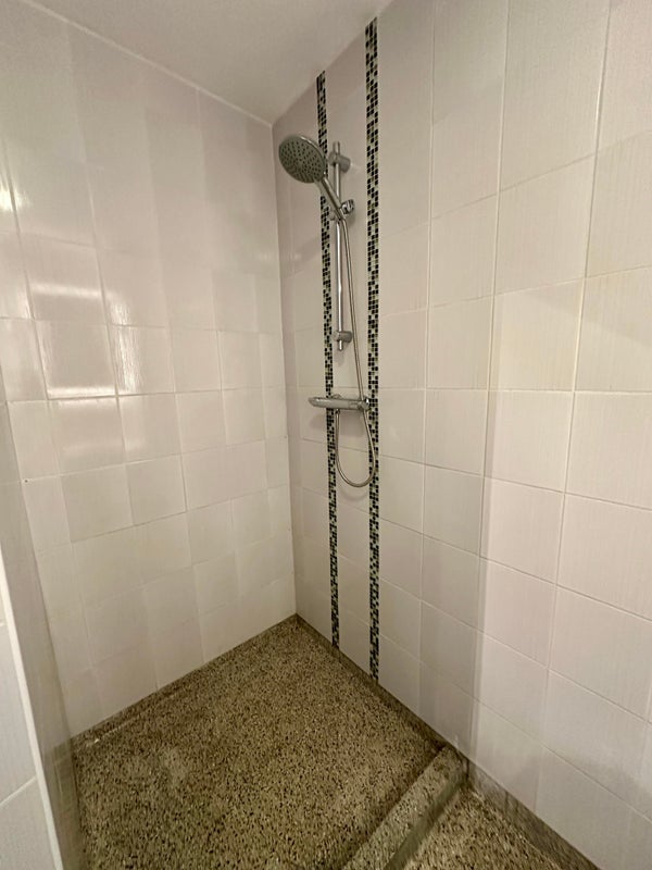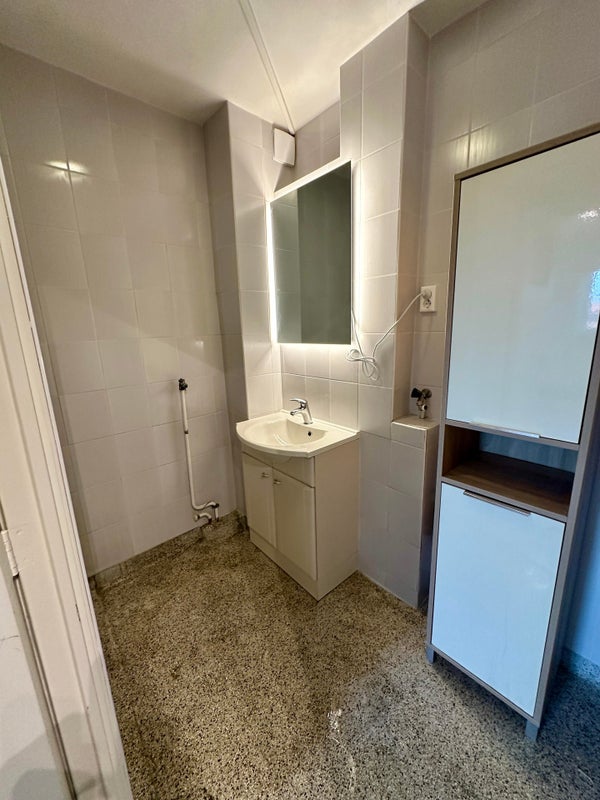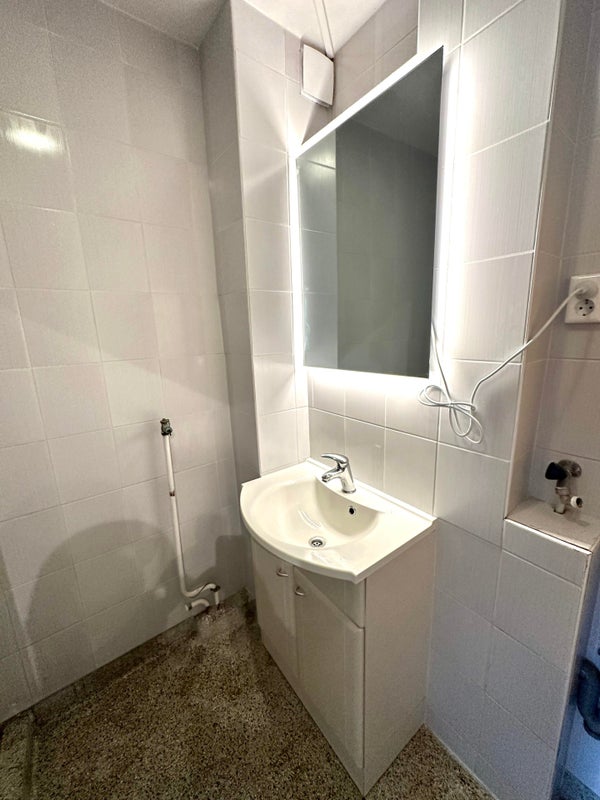 - Badezimmer mit Dusche, Waschbecken und Waschmaschinenanschluss (Waschmaschine bleibt vorhanden)