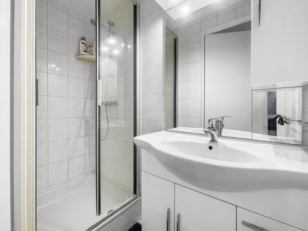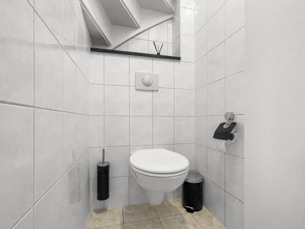 Die Küche befindet sich an der Vorderseite und ist mit verschiedenen Einbaugeräten wie einer Dunstabzugshaube, einem Induktionskochfeld, einer Geschirrspülmaschine und einem Ofen ausgestattet. Separates WC und Badezimmer mit Dusche und Waschbecken-Möbel.