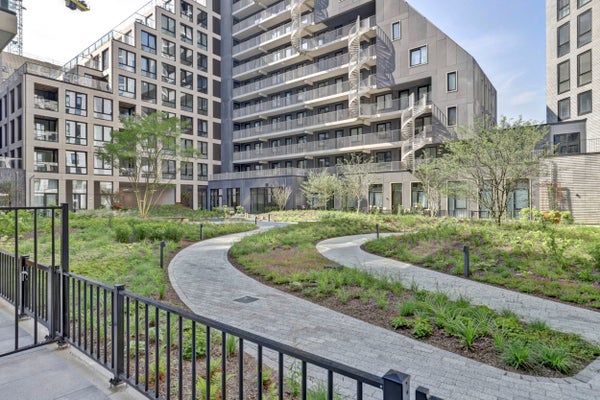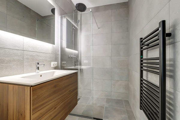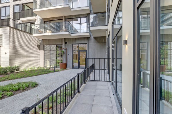 Das Wohnzimmer verfügt über eine moderne Wohnküche mit verschiedenen Einbaugeräten, darunter ein Induktionskochfeld, eine Umluft-Dunstabzugshaube, ein Kühlschrank, ein separater Gefrierschrank und eine Mikrowelle mit Backfunktion. Vom Wohnzimmer aus haben Sie direkten Zugang zu Ihrem eigenen Außenbereich. Dieser private Außenbereich grenzt an den gemeinschaftlichen Innenhof, sodass Sie den Komfort eines gemeinsamen Grünraums haben, der direkt von Ihrem eigenen Garten aus erreichbar ist.