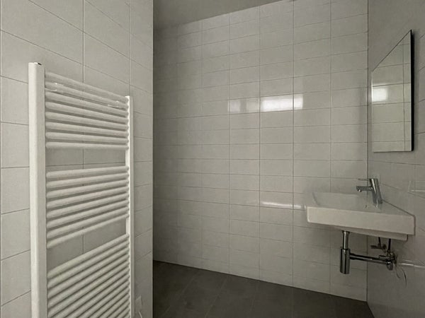 Das Badezimmer im 1. Stock hat eine hängende Toilette und ist bis zur Decke gefliest. Außerdem ist es mit einem Spiegel, einem Handtuchheizkörper und einer Duschwand ausgestattet.