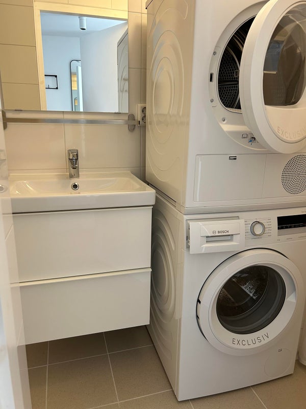 Das moderne Badezimmer ist mit einer begehbaren Dusche, einer Toilette, einem Designerheizkörper, einem Waschbecken, einer Waschmaschine und einem Trockner ausgestattet.