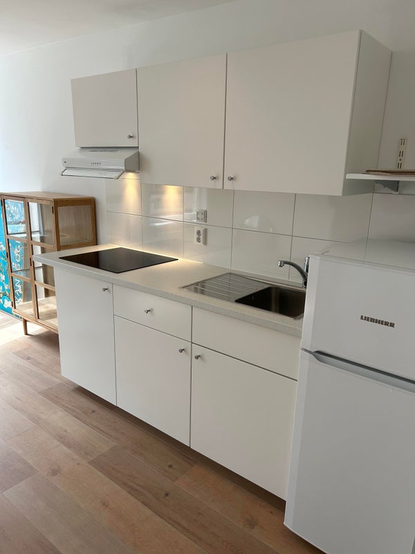 Es gibt eine offene Küche ausgestattet mit Kochfeld und Kühlschrank-Gefrierkombination.