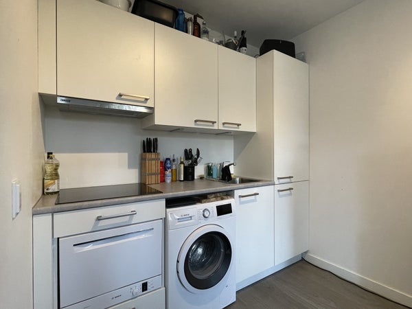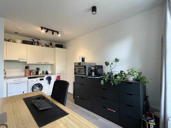 Diese Wohnung befindet sich im ersten Stock. Die Wohnung verfügt über ein geräumiges Wohnzimmer mit offener Küche. Die Küche ist ausgestattet mit einer Dunstabzugshaube, einer Kombi-Mikrowelle, einem Kühlschrank und einem Induktionskochfeld. Auch der Anschluss für die Waschmaschine befindet sich in der Küche.