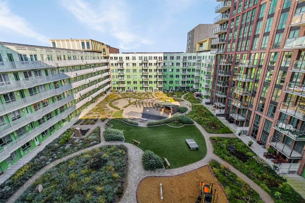 Darüber hinaus verfügt das Gebäude über einen riesigen gemeinschaftlichen Innenhof, in dem die Bewohner sich in einer grünen Umgebung begegnen können, mitten in der Stadt!