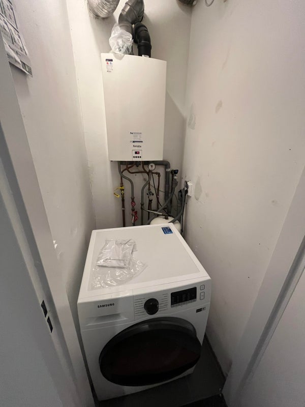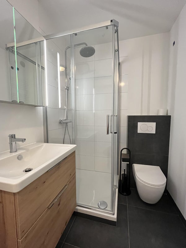 Das Badezimmer ist ausgestattet mit WC, Dusche, Badezimmermöbel mit integriertem Waschbecken und Designheizkörper. Darüber hinaus gibt es im Flur einen separaten Waschraum. Das Schlafzimmer befindet sich auf der Rückseite der Wohnung.