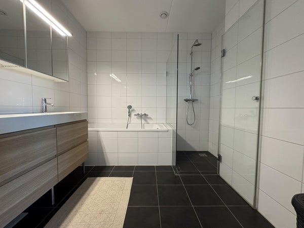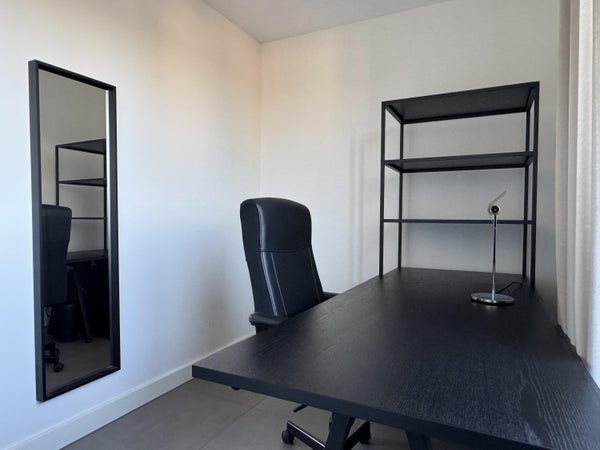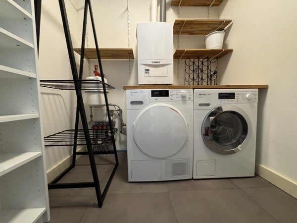 Die Wohnung verfügt über zwei Schlafzimmer. Das Hauptschlafzimmer ist geräumig und mit Klimaanlage und einem Fernseher mit Chromecast ausgestattet. Das zweite Schlafzimmer ist derzeit als Büro eingerichtet und eignet sich hervorragend als Home-Office. Darüber hinaus gibt es ein großes Badezimmer mit Badewanne, Dusche und zwei Waschbecken. Außerdem verfügt die Wohnung über eine separate Toilette und einen praktischen Abstellraum mit einer Miele-Waschmaschine, einem Miele-Wäschetrockner und zusätzlichem Stauraum.