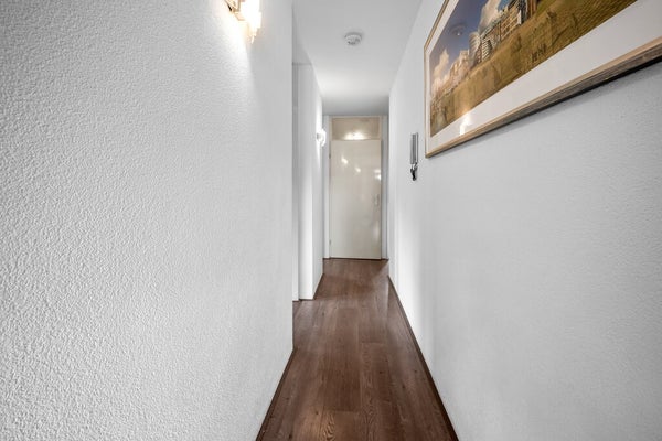 Wohnungsaufteilung: Eingangsbereich mit einem Stromkasten und einem hängenden WC mit kleinem Waschbecken. Am Ende des Flures finden Sie das gepflegte Badezimmer, ausgestattet mit einer Duschkabine, einem Waschbecken und zusätzlichem Stauraum.