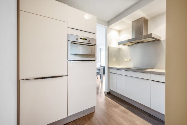 Die offene Küche hat einen modernen L-förmigen Grundriss mit zwei Einbauschränken und verschiedenen eingebauten Geräten. Es gibt auch einen praktischen Abstellraum mit Anschlüssen für eine Waschmaschine und einen Wäschetrockner.