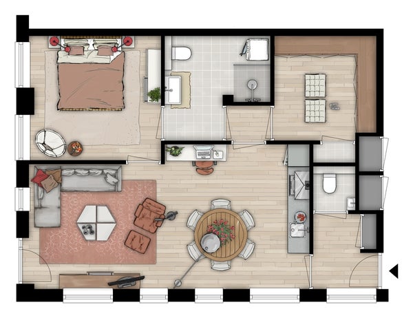 Sie betreten das Apartment vom zentralen Flur aus, der Zugang zum Sicherungskasten, einer Toilette und dem Wohnzimmer mit offener Küche hat. Die Küche ist mit allem ausgestattet, was man braucht, einschließlich Kühlschrank, Geschirrspüler, Backofen und Induktionskochfeld mit Belüftung. Vom Wohnzimmer aus erreichen Sie die anderen Räume, wie das Schlafzimmer, das Arbeitszimmer und das Badezimmer.