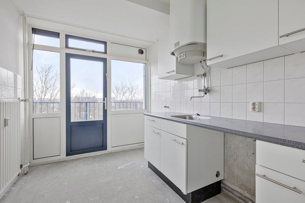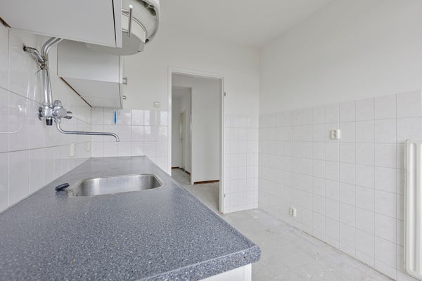 Die Wohnung verfügt über eine abgeschlossene Küche ohne Einbaugeräte. Der Balkon ist auch von der Küche aus erreichbar. Die Wohnung hat außerdem ein Badezimmer mit Dusche, Badewanne und Waschbecken sowie eine separate Toilette.