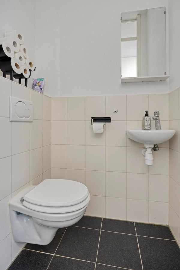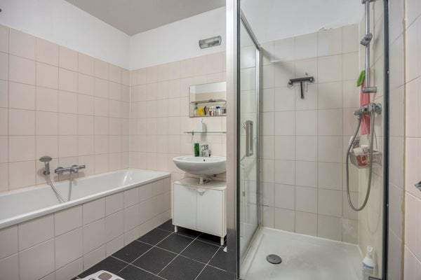 Das komplett geflieste Badezimmer ist mit einer Dusche, Badewanne und Waschbecken ausgestattet. Außerdem gibt es einen Abstellraum mit Waschmaschine und zusätzlichem Stauraum.