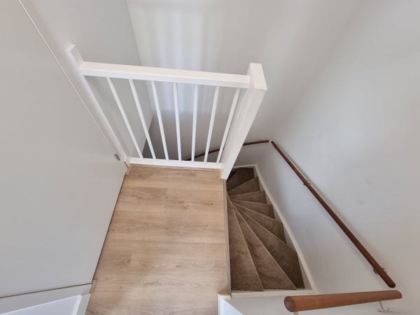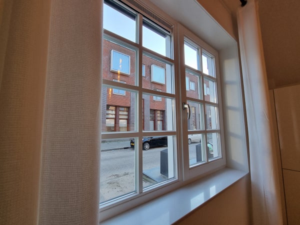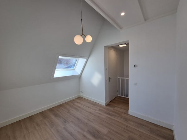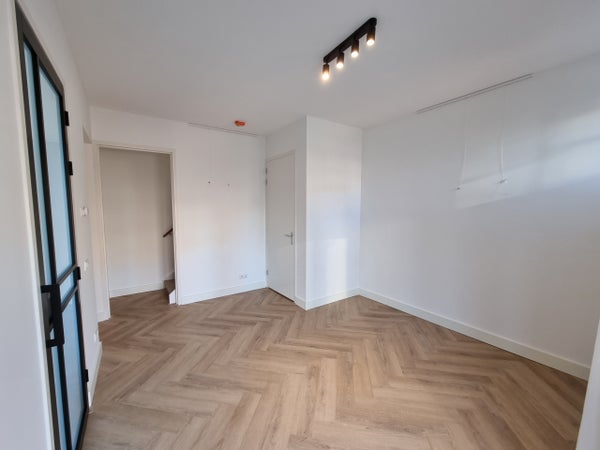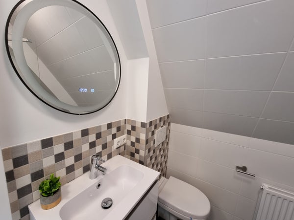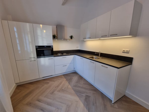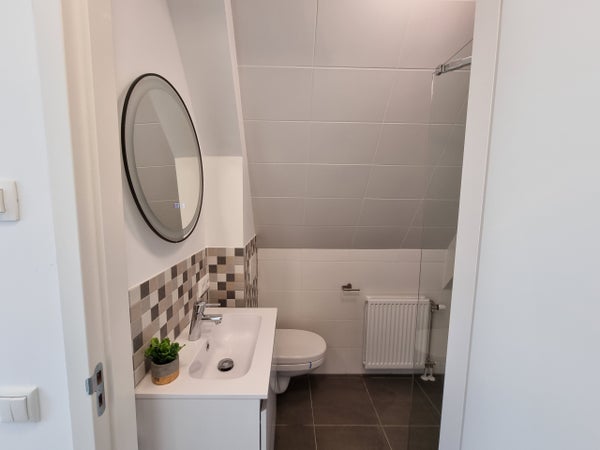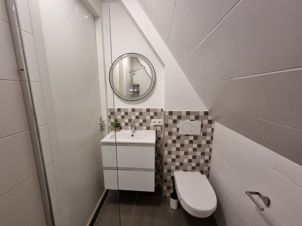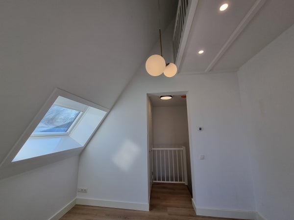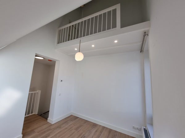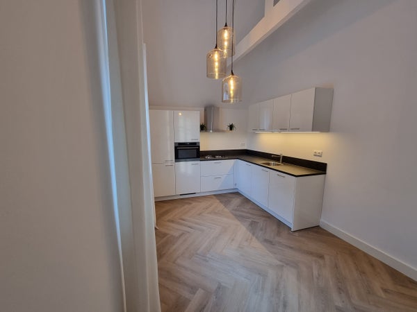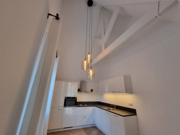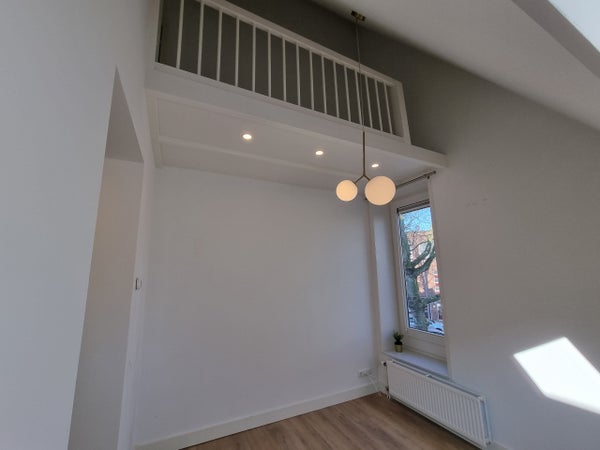 Aufteilung: Über einen eigenen Eingang gelangen Sie in die Wohnung. Durch eine Glas-Schiebetür im Flur, in dem sich auch die Toilette befindet, gelangen Sie ins helle Wohnzimmer mit offener Küche, das ein beeindruckendes Deckenhöhe von 5 Metern und ein charakteristisches Spitzdach aufweist. Die gesamte Wohnung ist mit PVC- Fischgrätboden und Fußbodenheizung ausgestattet. Die moderne Küche in L-Form ist in hellen Farben gehalten und ist ausgestattet mit einem Gasherd, Dunstabzugshaube, Kühlschrank, Gefrierschrank, Mikrowelle/Backofen-Kombination und Geschirrspüler. Auf dieser Etage befindet sich auch ein zusätzlicher Stauraum. Über eine Treppe gelangen Sie in die zweite Etage, wo sich das geräumige und helle Schlafzimmer befindet, das mit einem Laminatboden in heller Eichenfarbe und Fensterjalousien ausgestattet ist. Hinweis: Dieser Raum hat eine Galerie, die zusätzlichen Schlaf-/Stauraum bietet. Das Badezimmer ist vollständig gefliest und in hellen Farben gehalten und verfügt über eine zusätzliche Toilette, eine begehbare Dusche und ein Waschbecken mit Spiegel, der mit Beleuchtung und digitaler Uhr ausgestattet ist. Diese einzigartige Wohnung war ursprünglich Teil der Montessori-Schule, die aus dem Jahr 1920 stammt. Diese wurde anschließend vollständig renoviert und dabei klassische Elemente bewahrt. Zusammen mit dem anderen Mieter dieses Komplexes verfügen Sie über einen einzigartigen, gut gepflegten Außenbereich mit Garten, der durch ein abgeschlossenes Tor zugänglich ist. Hinweis: Einschließlich privatem Parkplatz, gemeinsamer Außenbereich mit Garten und externem Abstellraum. Neue Fotos folgen.