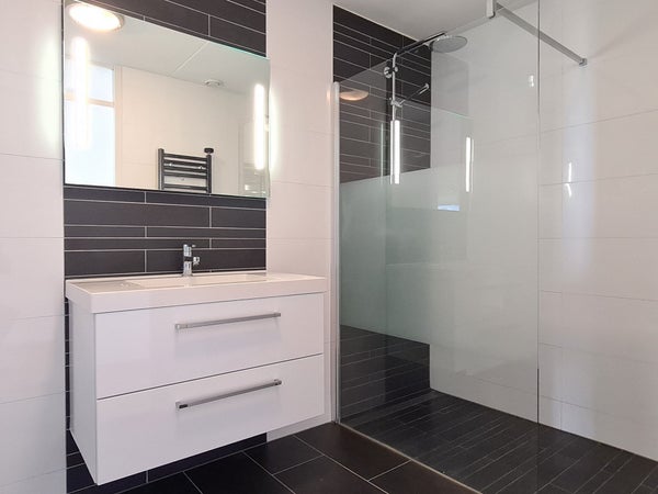 Moderne Badezimmer mit Waschbecken, begehbarer Dusche und 2. Toilette.