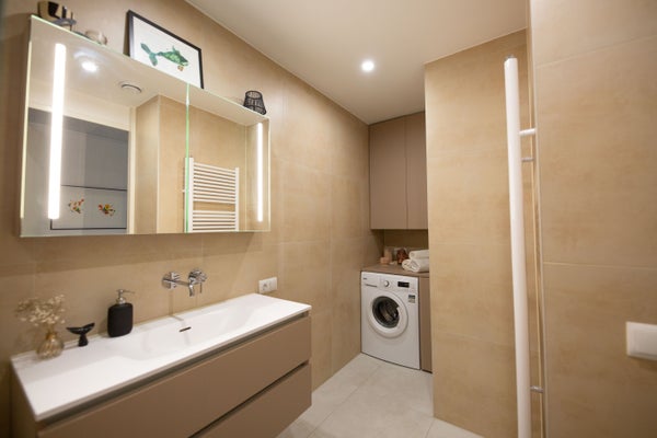 Die Wohnung verfügt über große Fenster, die viel natürliches Licht hereinlassen und den ganzen Tag über eine angenehme und luftige Atmosphäre schaffen. Die großen Fenster im Wohnbereich können vollständig geöffnet werden, was das Gefühl vermittelt, draußen zu sitzen, während man den Komfort seines Zuhauses genießt. Perfekt, um mit einem Kaffee zu entspannen oder eine frische Brise hereinzulassen. Die moderne offene Küche ist komplett ausgestattet und ideal für den täglichen Gebrauch oder gelegentliches Unterhalten. Mit dem Energielabel A ist die Wohnung sowohl energieeffizient als auch komfortabel.