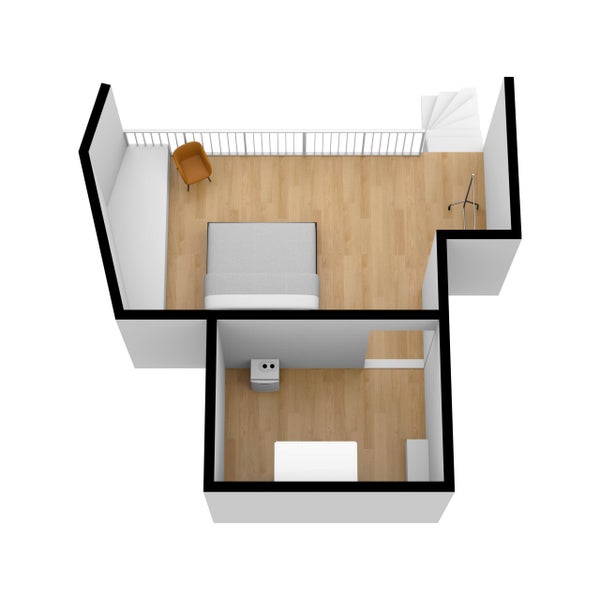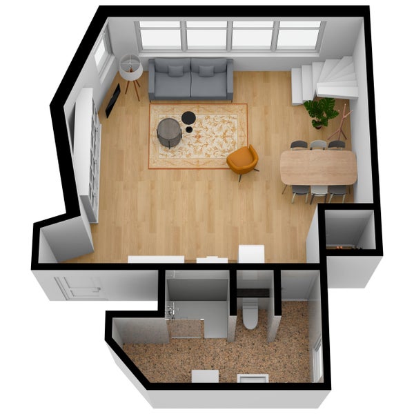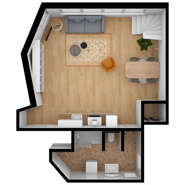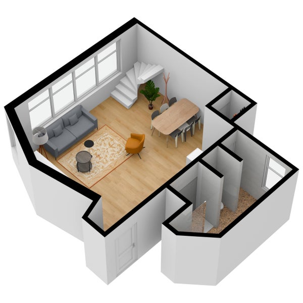 Aufteilung: Diese Wohnung erstreckt sich über 2 Wohnebenen, 1. Stock und eine Galerie. Eingang im 1. Stock in die Diele, von hier Zugang zum Badezimmer mit Toilette und Abstellraum mit Wasch-/Trockenkombination. Durch die Diele Zugang zum Wohn- und Essbereich mit komplett neuer Küche. Über die Wendeltreppe Zugang zur Galerie, wo sich das Schlafzimmer befindet.