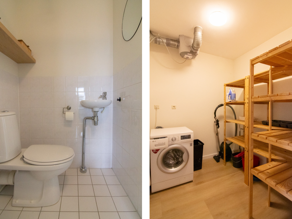 Es gibt eine separate Toilette mit einem kleinen Waschbecken und außerdem einen Abstellraum mit Waschmaschine und Regalen zur Aufbewahrung.