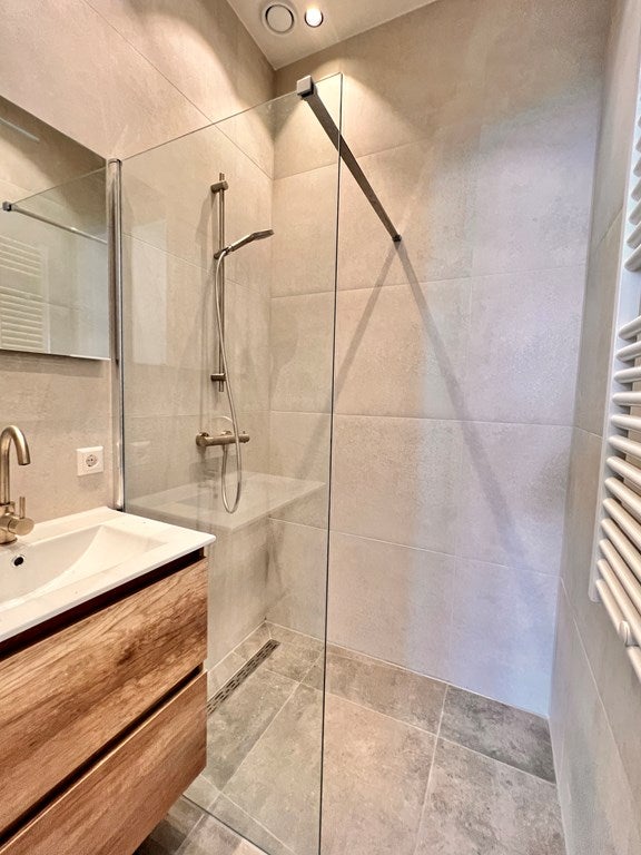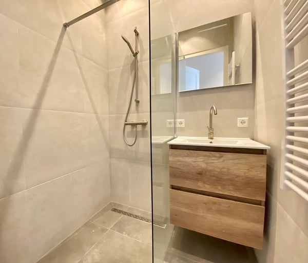 Beide Badezimmer sind mit einer Dusche, einem Waschbecken mit Spiegel und einem Handtuchheizkörper ausgestattet.