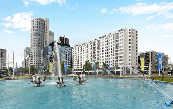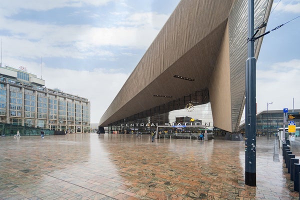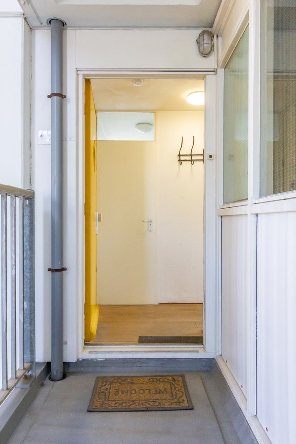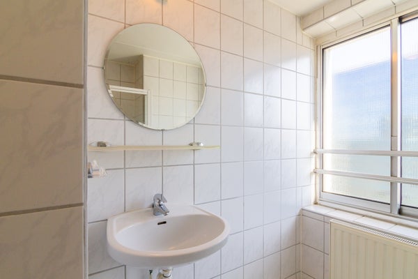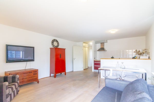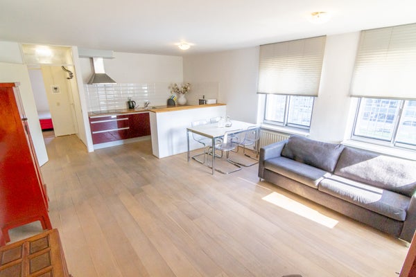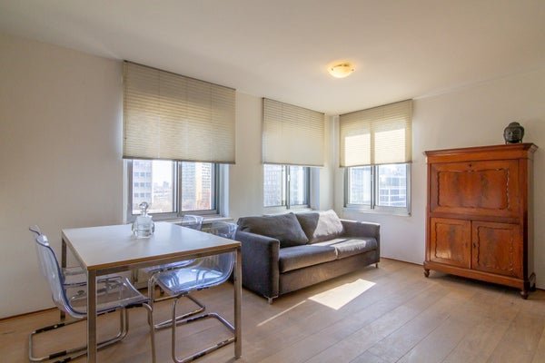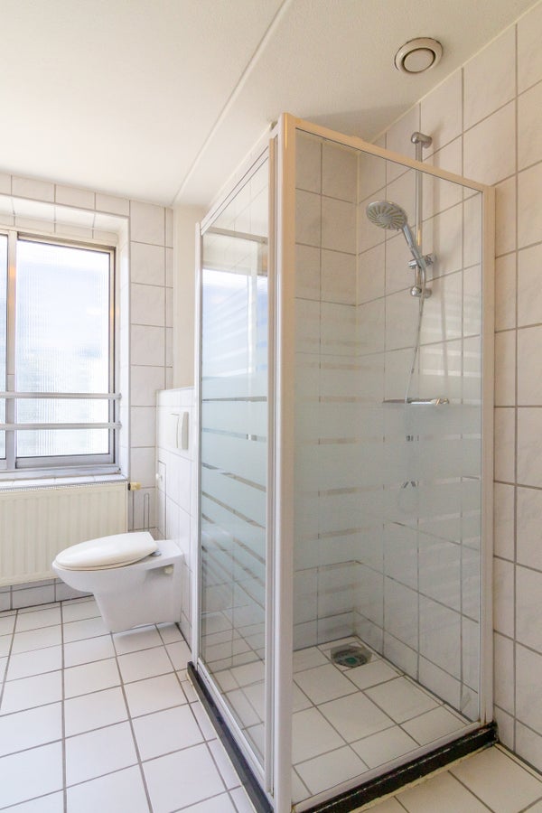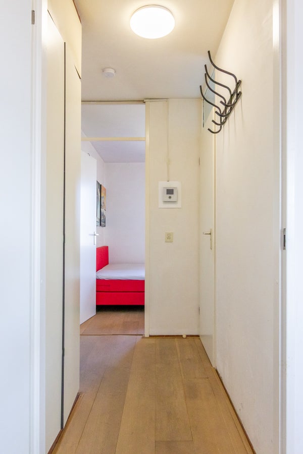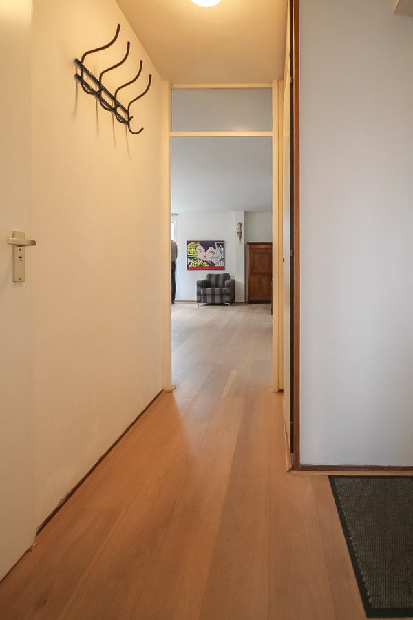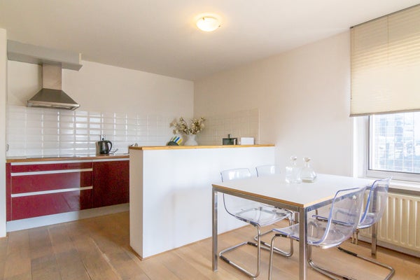 Von der Wohnzimmer aus blicken Sie über vielleicht einen der bekanntesten Orte in Rotterdam: den Hofplein. Durch die gesamte Wohnung verläuft ein breiter, hellfarbener Parkettboden, der für ein frisches Erscheinungsbild sorgt.