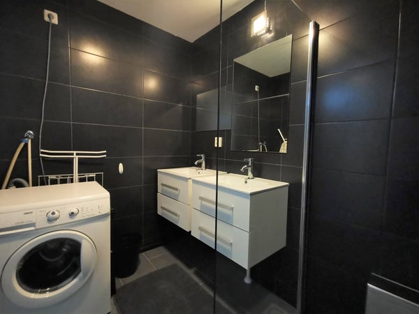 Das moderne und renovierte Badezimmer ist vom Flur aus zugänglich und ist mit einem doppelten Waschbecken mit Möbeln, einer geräumigen begehbaren Dusche und einer Waschmaschine-Trockner-Kombination ausgestattet.