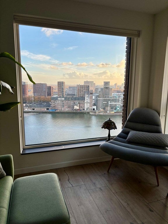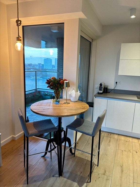 Erleben Sie das Wohnen auf hohem Niveau mit einem einzigartigen Panoramablick auf die Maas. Dieses stilvolle und vollständig möblierte 2-Zimmer-Apartment bietet alles, was Sie brauchen. Mit einer großzügigen Terrasse, großen Fenstern und einem privaten Parkplatz ist es das ideale Zuhause für alle, die Komfort und Luxus in der pulsierenden Stadt Rotterdam suchen.