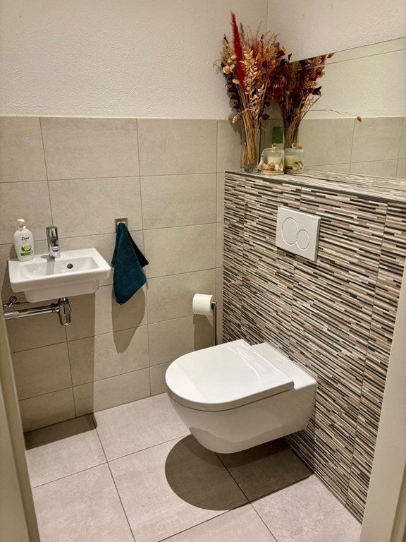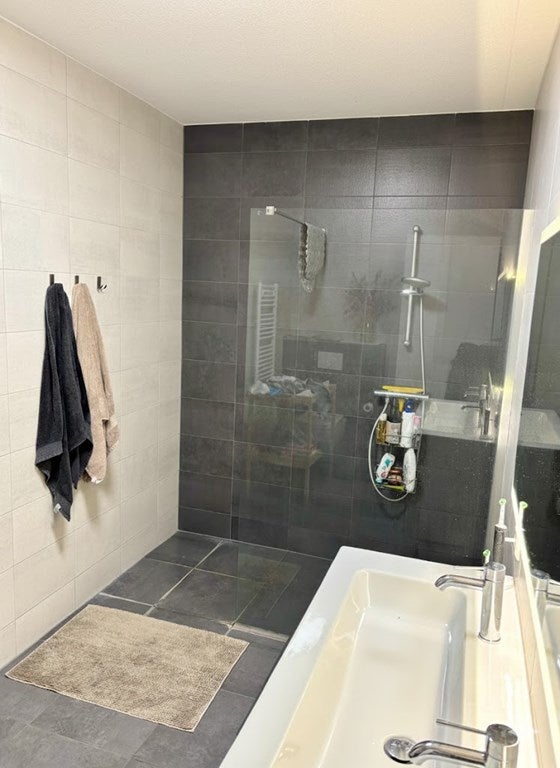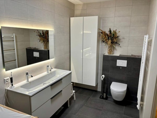 Das moderne Badezimmer verfügt über eine geräumige begehbare Dusche, ein Doppelwaschbecken mit Spiegel, Stauraum und WC. Es gibt auch eine separate schwebende Toilette mit einem kleinen Waschbecken.