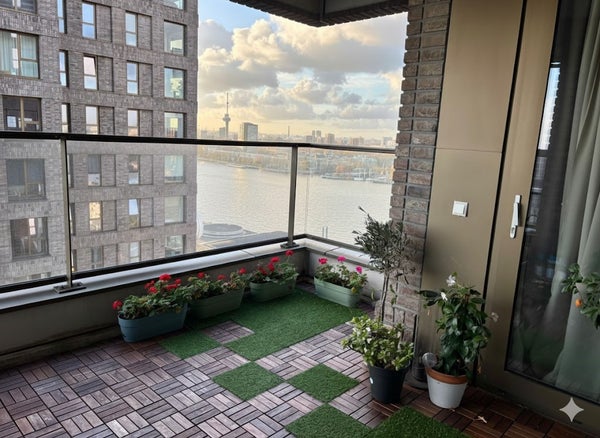 Vom Wohnzimmer aus haben Sie Zugang zur großen Terrasse von etwa 12 m2, die einen atemberaubenden Blick über die Skyline und den Fluss Maas bietet. Selbst an windigen Tagen ist es komfortabel, diese Terrasse aufgrund der Glasfenster zu genießen.