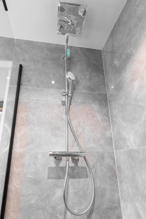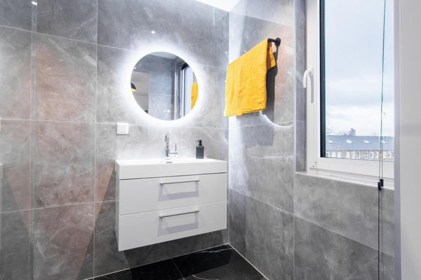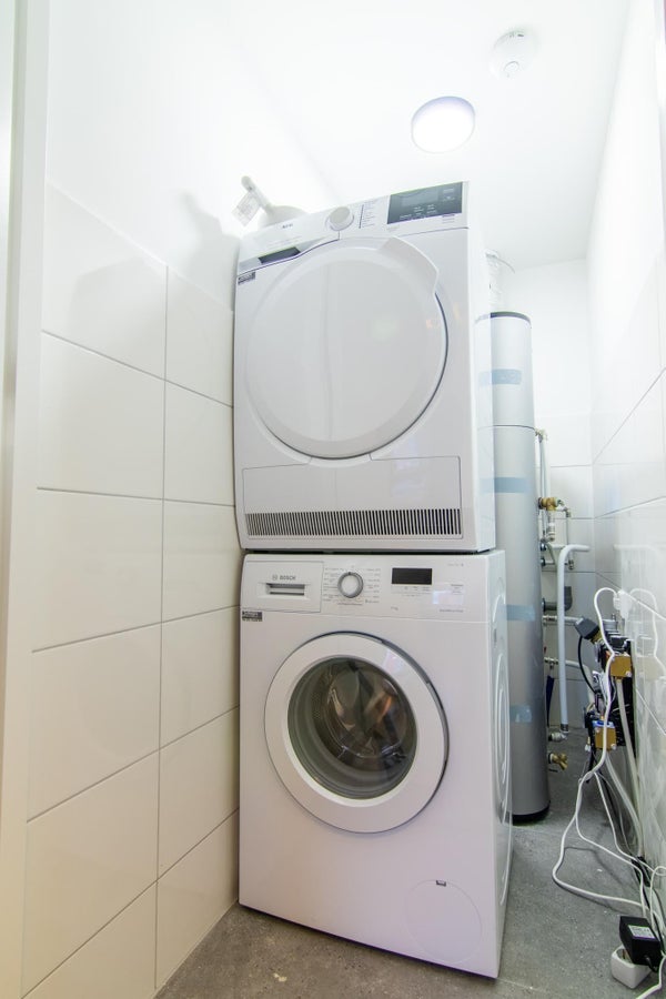 Bequemer Schlafbereich, Stauraum und ein brandneues Badezimmer mit begehbarer Dusche, Waschbecken und eigener Waschmaschine.