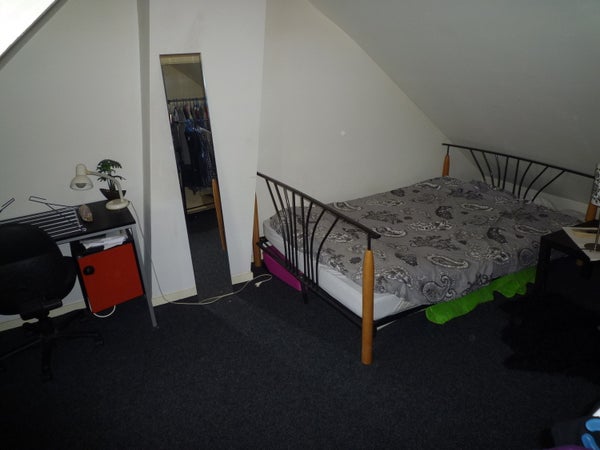 Das Schlafzimmer befindet sich im Dachgeschoss des Hauses und hat eine Fläche von ca. 13 m2. Das Schlafzimmer ist mit einem ordentlichen dunklen Teppichboden ausgestattet. Der Zugang zum Schlafzimmer erfolgt über eine feste Treppe vom Wohnzimmer.