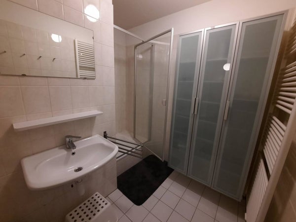 Sehr sauberes Badezimmer, ausgestattet mit einer Dusche, einem Waschbecken und einem praktischen Wandmöbel. Im Flur gibt es eine separate Toilette mit Waschbecken; außerdem gibt es einen Abstellraum, in dem eine Waschmaschine und ein Trockner untergebracht werden können.