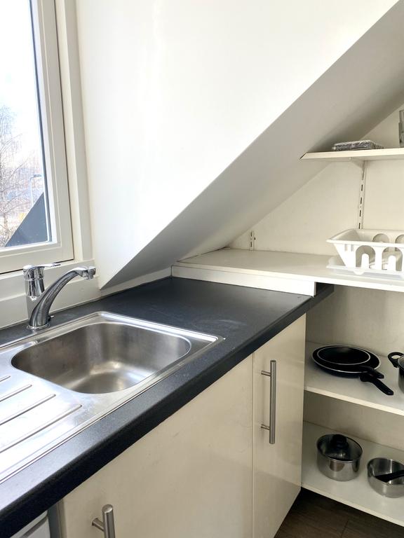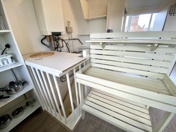 Die Wohnung besteht aus einem gemütlichen Raum und einem Schlafbereich mit einem feinen Bett. Das Bett, ausgestattet mit einer neuen und komfortablen Matratze, ist vom Wohnbereich durch einen geräumigen Kleiderschrank getrennt. Das Wohnzimmer ist gemütlich und verfügt über ein sehr bequemes Sofa mit Kissen, um bequem zu versinken. Es gibt einen separaten Essbereich mit einem ausziehbaren Ess-/Schreibtisch. Praktisch für zusätzliche Besuche oder all Ihre Dokumente, um effizient arbeiten zu können! Es gibt eine gepflegte offene Küche, die mit einem vollständigen (1 Jahr alten) Inventar ausgestattet ist. In dieser kompakten Studio-Apartment gibt es überraschend viel Stauraum.