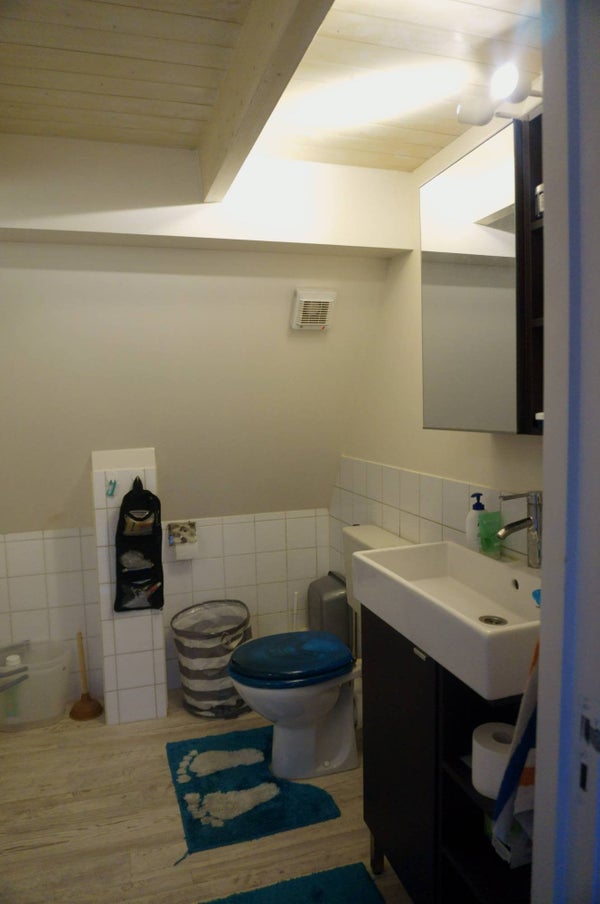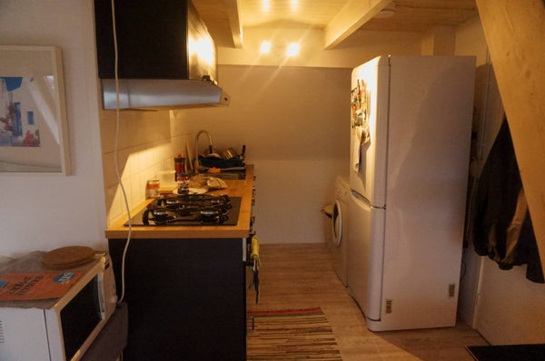 Eingang, Küche (6,5m2) ausgestattet mit Kochfeld, Dunstabzugshaube, Ofen, Mikrowelle und Kühlschrank mit Gefrierfach, Waschmaschine. Wohnzimmer (32m2). Badezimmer ausgestattet mit Badewanne, Waschbecken und Toilette. Treppe zur oberen Wohnebene, die aus einem geräumigen Schlafzimmer (6m x 5m) besteht.