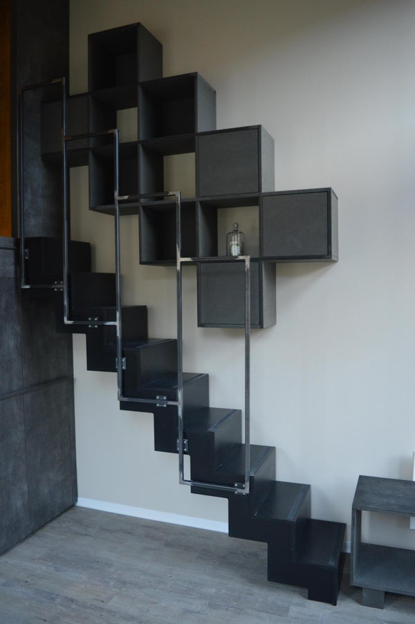 Von Wohnzimmer aus führt eine verschiebbare Treppe zu einem Schlafbereich mit viel Stauraum für Koffer, Boxen usw.