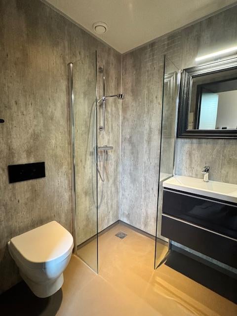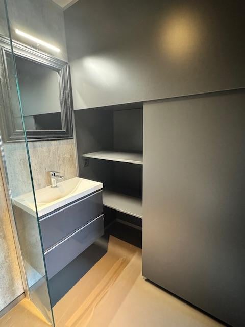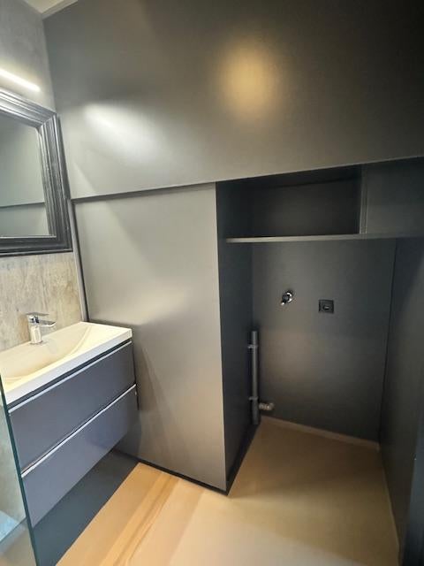Tür zum Badezimmer, ausgestattet mit einer Wasch-/Trockenanschluss, einem Waschtisch mit Schubladen, einem Spiegel mit Beleuchtung, einem hängenden WC, einem Handtuchradiator und einer begehbaren Dusche mit Thermostatarmatur.
