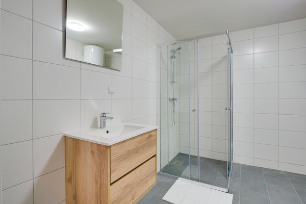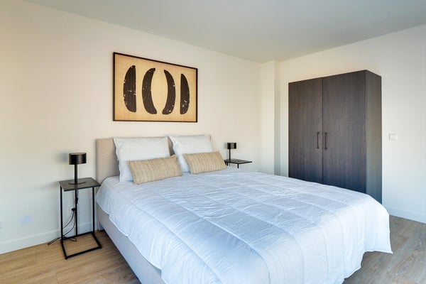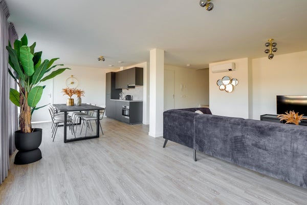 Jede Wohnung ist sehr effizient aufgeteilt und verfügt über ein geräumiges Wohnzimmer mit einer offenen Luxus-Küche. Die Küche ist mit allem ausgestattet, was man braucht: Kombi-Mikrowellenofen, Induktionskochfeld, Geschirrspüler, Kühl-Gefrierkombination, Geschirr, Töpfe, Wasserkocher, Toaster usw. Über die Küche gelangt man ins Bad mit begehbarer Dusche und WC. Vom Wohnzimmer aus sind sowohl links als auch rechts die beiden Schlafzimmer zu finden.