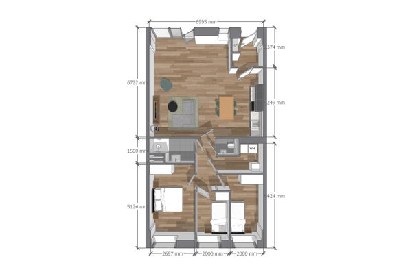 Holzoptikböden, Verdunkelungsvorhänge, vollständig möbliert inklusive Bett- und Tischwäsche.