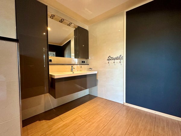 Über das abschließbare Zugangstor erreicht man die großzügige teilweise überdachte Terrasse (ca. 55 m2). Vom Terrassendach gelangt man in das geräumige Wohnzimmer (ca. 43 m2) mit Natursteinböden. Die halboffene Luxus-Küche (ca. 15 m2) befindet sich im hinteren Teil der Wohnung. Die Küche ist mit einer Kühl-/Gefrierkombination, einem Induktionskochfeld, einem Einbauofen, einer Einbau-Mikrowelle und einem Geschirrspüler ausgestattet. Neben der Küche gibt es ein Gäste-WC/Abstellraum mit Waschmaschinenanschluss (ca. 9 m2). Im Obergeschoss gibt es ein geräumiges Schlafzimmer (ca. 20 m2) mit Klimaanlage und ein geräumiges Luxus-Badezimmer (ca. 20 m2). Das Badezimmer ist mit allem Komfort ausgestattet, wie z. B. einem schwebenden WC, einem Bidet, einem Waschbecken, einer Badewanne, Fußbodenheizung und einer ebenerdigen Dusche mit beheiztem Sitzbank!