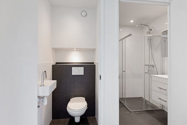 Der zentrale Eingang verfügt über ein Klingelsystem mit Briefkästen, eine Gegensprechanlage und Zugang zum Treppenhaus, den Aufzügen, den Lagerräumen und dem gemeinsamen Fahrradabstellraum.