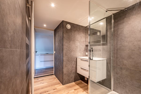 Der Wohnraum verfügt über ein schönes Wohnzimmer mit offener Küche, eine separate Schlafmezzanine und ein Badezimmer mit Dusche und WC. Die Küche ist mit einem eingebauten Kühlschrank, einem Kochfeld, einem Geschirrspüler ausgestattet und luxuriös gestaltet. Das Badezimmer ist mit einem Waschbecken plus Möbel, einem hängenden WC und einer Dusche ausgestattet. Alle Räume werden mit Bodenbelägen ausgeliefert.